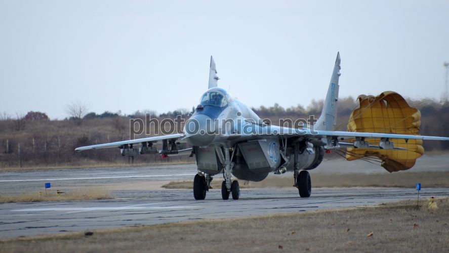 Самолет Севастопольской бригады тактической авиации Воздушных Сил Вооруженных Сил Украины приземляется после тренировочного полета, в Севастополе (Крым), в пятницу, 16 марта 2012 г. В рамках подготовки к Евро 2012 в Севастопольской бригаде тактической авиации прошли тренировочные полеты. Фото Василия Батанова / УНИАН