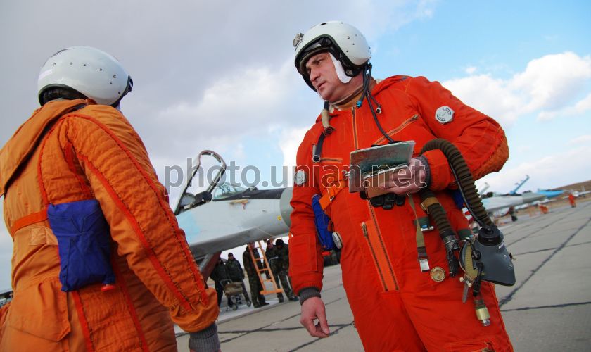 Лётчики Севастопольской бригады тактической авиации Воздушных Сил Вооруженных Сил Украины перед началом тренировочных полетов, в Севастополе (Крым), в пятницу, 16 марта 2012 г. В рамках подготовки к Евро 2012 в Севастопольской бригаде тактической авиации прошли тренировочные полеты. Фото Василия Батанова / УНИАН