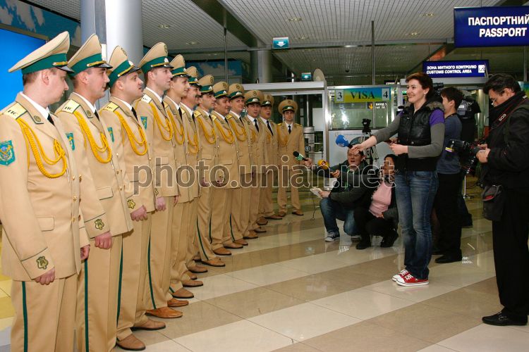 Ансамбль песни и танца Государственной пограничной службы Украины и журналисты во время презентации песни, посвящённой финальной части чемпионата Европы по футболу - 2012, в аэропорту «Борисполь» (Киевская область), в среду, 21 марта 2012 г. В этот день в аэропорту «Борисполь» состоялась презентация песни «We are the players», приуроченная финальной части чемпионата Европы по футболу 2012 г. Представил песню заслуженный артист Украины Виталий Козловский в сопровождении ансамбля песни и танца Государственной пограничной службы Украины. Фото Анны Корбут / УНИАН