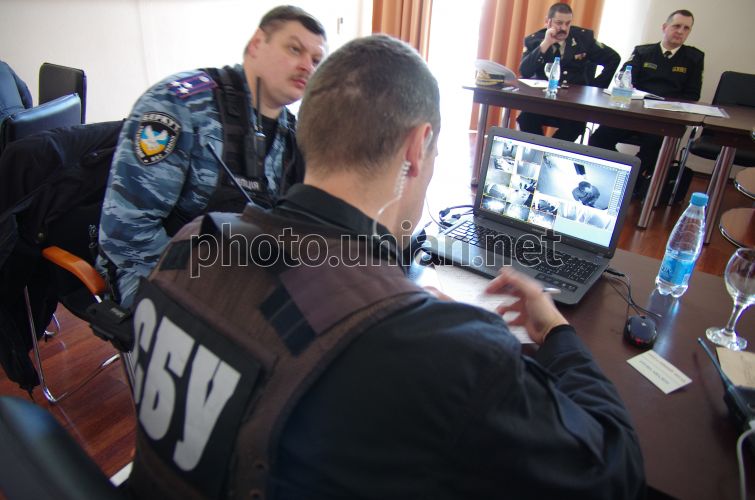Сотрудник СБУ просматривает съемку с камер наблюдения во время проведения антитеррористических учений координационной группы Антитеррористического центра при управлении Службы безопасности Украины в одной из гостиниц в Севастополе (Крым), во вторник, 27 марта 2012 г. В этот день в центральной части Севастополя состоялись плановые антитеррористические учения координационной группы Антитеррористического центра при управлении Службы безопасности Украины в городе Севастополе. В специальных учениях также были задействованы военная служба правопорядка Вооруженных Сил Украины и морские пограничники. Учения силовых ведомств региона проводятся дважды в год в соответствии с планом Антитеррористического центра при Службе безопасности Украины. Так, спецназ СБУ «Альфа» освобождал «заложников» и обезвреживал условных террористов в рыбном и морском портах, на стадионе ФК «Севастополь», в аэропорту «Бельбек», в районе гидротехнических сооружений Байдарской долины, в театре им. А.В. Луначарского и на других жизненно важных объектах города. Руководитель учений начальник Севастопольского управления СБУ полковник Владимир Воропай, подводя итоги, отметил, что главной целью тактико-специального мероприятия в центре Севастополя была отработка взаимодействия силовых ведомств региона при возникновении террористической опасности. Все задачи, стоящие перед участниками учений, выполнены. Фото Василия Батанова / УНИАН
