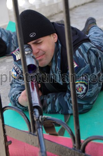 Снайпер спецподразделения милиции "Беркут" во время проведения антитеррористических учений координационной группы Антитеррористического центра при управлении Службы безопасности Украины в одной из гостиниц в Севастополе (Крым), во вторник, 27 марта 2012 г. В этот день в центральной части Севастополя состоялись плановые антитеррористические учения координационной группы Антитеррористического центра при управлении Службы безопасности Украины в городе Севастополе. В специальных учениях также были задействованы военная служба правопорядка Вооруженных Сил Украины и морские пограничники. Учения силовых ведомств региона проводятся дважды в год в соответствии с планом Антитеррористического центра при Службе безопасности Украины. Так, спецназ СБУ «Альфа» освобождал «заложников» и обезвреживал условных террористов в рыбном и морском портах, на стадионе ФК «Севастополь», в аэропорту «Бельбек», в районе гидротехнических сооружений Байдарской долины, в театре им. А.В. Луначарского и на других жизненно важных объектах города. Руководитель учений начальник Севастопольского управления СБУ полковник Владимир Воропай, подводя итоги, отметил, что главной целью тактико-специального мероприятия в центре Севастополя была отработка взаимодействия силовых ведомств региона при возникновении террористической опасности. Все задачи, стоящие перед участниками учений, выполнены. Фото Василия Батанова / УНИАН