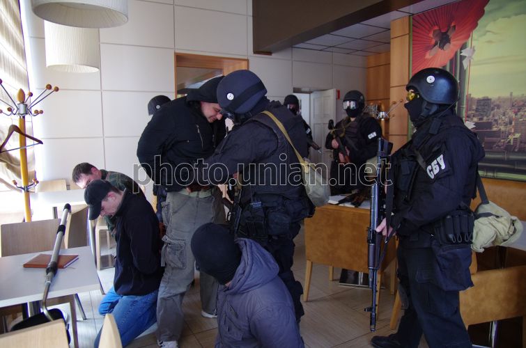 Офицеры спецподразделения СБУ «Альфа» держат на мушке "террористов" в одной из гостиниц в Севастополе (Крым), во вторник, 27 марта 2012 г. В этот день в центральной части Севастополя состоялись плановые антитеррористические учения координационной группы Антитеррористического центра при управлении Службы безопасности Украины в городе Севастополе. В специальных учениях также были задействованы военная служба правопорядка Вооруженных Сил Украины и морские пограничники. Учения силовых ведомств региона проводятся дважды в год в соответствии с планом Антитеррористического центра при Службе безопасности Украины. Так, спецназ СБУ «Альфа» освобождал «заложников» и обезвреживал условных террористов в рыбном и морском портах, на стадионе ФК «Севастополь», в аэропорту «Бельбек», в районе гидротехнических сооружений Байдарской долины, в театре им. А.В. Луначарского и на других жизненно важных объектах города. Руководитель учений начальник Севастопольского управления СБУ полковник Владимир Воропай, подводя итоги, отметил, что главной целью тактико-специального мероприятия в центре Севастополя была отработка взаимодействия силовых ведомств региона при возникновении террористической опасности. Все задачи, стоящие перед участниками учений, выполнены. Фото Василия Батанова / УНИАН