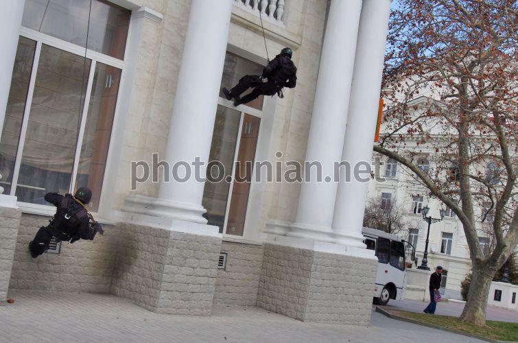 Офицеры спецподразделения СБУ «Альфа» во время захвата "террористов" в Севастополе (Крым), во вторник, 27 марта 2012 г. В этот день в центральной части Севастополя состоялись плановые антитеррористические учения координационной группы Антитеррористического центра при управлении Службы безопасности Украины в городе Севастополе. В специальных учениях также были задействованы военная служба правопорядка Вооруженных Сил Украины и морские пограничники. Учения силовых ведомств региона проводятся дважды в год в соответствии с планом Антитеррористического центра при Службе безопасности Украины. Так, спецназ СБУ «Альфа» освобождал «заложников» и обезвреживал условных террористов в рыбном и морском портах, на стадионе ФК «Севастополь», в аэропорту «Бельбек», в районе гидротехнических сооружений Байдарской долины, в театре им. А.В. Луначарского и на других жизненно важных объектах города. Руководитель учений начальник Севастопольского управления СБУ полковник Владимир Воропай, подводя итоги, отметил, что главной целью тактико-специального мероприятия в центре Севастополя была отработка взаимодействия силовых ведомств региона при возникновении террористической опасности. Все задачи, стоящие перед участниками учений, выполнены. Фото Василия Батанова / УНИАН