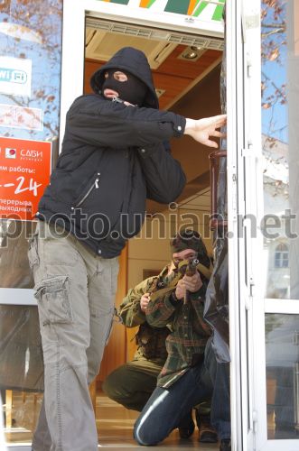 "Террористы" стоят с автоматами возле "заложников" во время проведения антитеррористических учений координационной группы Антитеррористического центра при управлении Службы безопасности Украины в одной из гостиниц в Севастополе (Крым), во вторник, 27 марта 2012 г. В этот день в центральной части Севастополя состоялись плановые антитеррористические учения координационной группы Антитеррористического центра при управлении Службы безопасности Украины в городе Севастополе. В специальных учениях также были задействованы военная служба правопорядка Вооруженных Сил Украины и морские пограничники. Учения силовых ведомств региона проводятся дважды в год в соответствии с планом Антитеррористического центра при Службе безопасности Украины. Так, спецназ СБУ «Альфа» освобождал «заложников» и обезвреживал условных террористов в рыбном и морском портах, на стадионе ФК «Севастополь», в аэропорту «Бельбек», в районе гидротехнических сооружений Байдарской долины, в театре им. А.В. Луначарского и на других жизненно важных объектах города. Руководитель учений начальник Севастопольского управления СБУ полковник Владимир Воропай, подводя итоги, отметил, что главной целью тактико-специального мероприятия в центре Севастополя была отработка взаимодействия силовых ведомств региона при возникновении террористической опасности. Все задачи, стоящие перед участниками учений, выполнены. Фото Василия Батанова / УНИАН