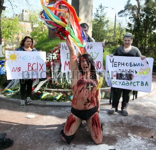 Участник акции протеста «Нет - мутациям в стране!», облитый красной жидкостью, держит венок на фоне плакатов возле Мемориального кургана героев Чернобыля в Киеве, в четверг, 26 апреля 2012 г. Во время поминального молебна, который завершился возложением цветов к мемориальному кургану героев Чернобыля возле церкви Святого Архангела Михаила состоялась акция протеста "Нет - мутациям в стране!". Участники акции выступили против захоронения в Украине ядерных отходов зарубежных стран на территории Чернобыля. Фото Евгения Малолетки / УНИАН