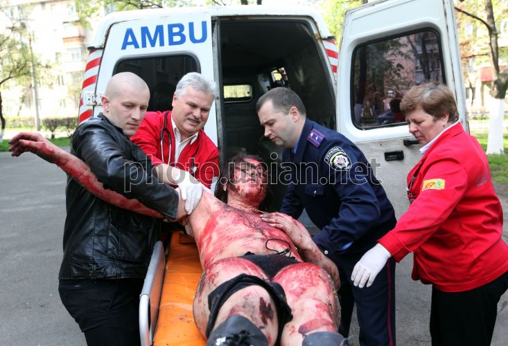 Врачи несут на носилках к автомобилю скорой помощи участника акции протеста «Нет - мутациям в стране!», которому стало плохо, в Киеве, в четверг, 26 апреля 2012 г. Во время поминального молебна, который завершился возложением цветов к мемориальному кургану героев Чернобыля возле церкви Святого Архангела Михаила состоялась акция протеста "Нет - мутациям в стране!". Участники акции выступили против захоронения в Украине ядерных отходов зарубежных стран на территории Чернобыля. В этот день в Украине проходят траурные мероприятия, посвященные 26-й годовщине аварии на Чернобыльской АЭС. Фото Евгения Малолетки / УНИАН