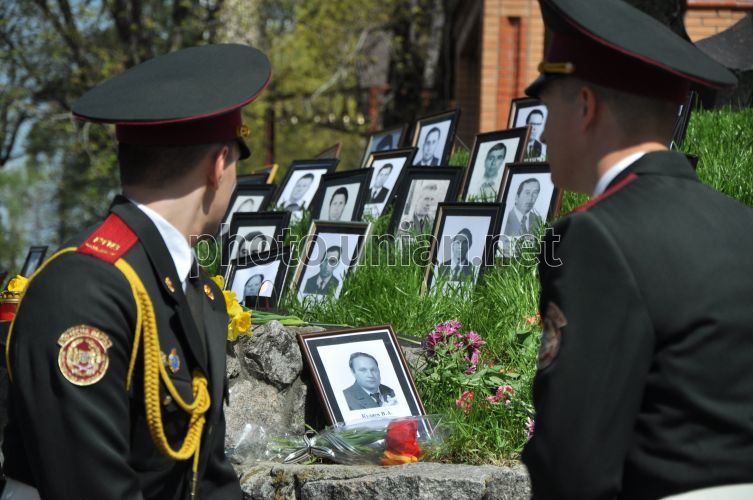 Воины роты почетного караула возле фотографий киевлян, которые умерли в результате Чернобыльской катастрофы, на территории Мемориала Чернобыльцев во время Всеукраинской акции поминовения жертв взрыва на ЧАЭС, а также жертв борьбы с режимом за свои права, в Киеве, в четверг, 26 апреля 2011 г. В этот день в Украине проходят траурные мероприятия, посвященные 26-й годовщине аварии на Чернобыльской АЭС. Авария на Чернобыльской АЭС произошла ночью 26 апреля 1986 года: произошел взрыв, который полностью разрушил 4-й реактор. В результате взрыва в атмосферу было выброшено 190 тонн радиоактивных веществ. По данным экспертов, суммарный выброс радиоактивных веществ составил 50 млн. кюри, что равнозначно последствиям взрывов 500 атомных бомб, сброшенных в 1945 году на Хиросиму. Радиоактивными нуклидами были загрязнены более 145 тысяч кв. км территории Украины, России и Беларуси. После аварии из 30-километровой зоны вокруг АЭС были эвакуированы более 115 тысяч человек. Чернобыльскую АЭС закрыли 15 декабря 2000 г. В ходе ликвидации аварии погибли десятки людей, многие остались инвалидами. Фото Даниила Приходько / УНИАН