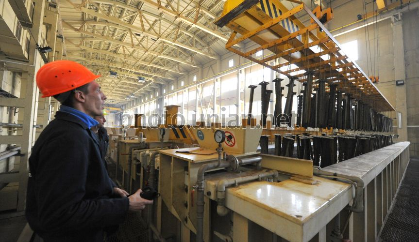 Рабочий в цеху во время открытия завода горячего цинкования металлоконструкций, в Черкассах, 25 апреля 2012 г. В Черкассах открыли завод горячего цинкования металлоконструкций “Металл Инвест” мощностью 36 тыс. тонн оцинкованной продукции в год. Этот завод первым в Украине сможет оцинковывать металлоконструкции длиной до 15 м и весом до 8 тонн, чего нет ни на одном заводе. Пока здесь работает 120 работников, а, выйдя на полную мощность, завод способен трудоустроить 200 человек. Фото Вячеслава Ромодана / УНИАН
