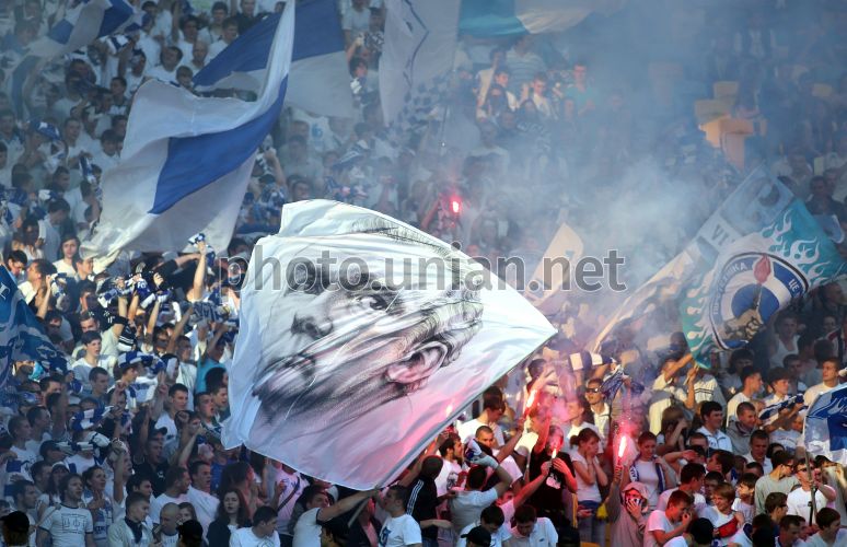 Болельщики ФК "Динамо" (Киев) с развернутым портретом легендарного тренера сборных СССР, Украины и киевского "Динамо" Валерия Лобановского, на футбольных трибунах во время матча Премьер-лиги Украины по футболу, в Киеве, в четверг, 10 мая 2012 г. Счет после первого тайма 1:0 в пользу ФК «Динамо» (Киев). Фото Андрея Скакодуба / УНИАН