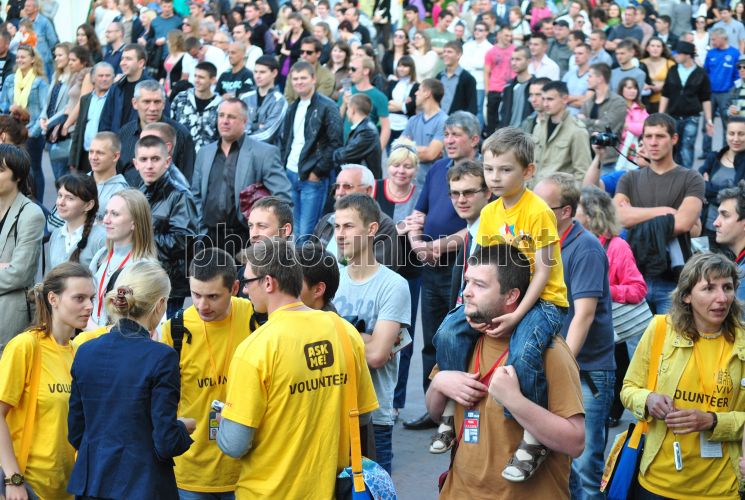 Болельщики ожидают начала торжественной церемонии открытия фан-зоны во Львове, в четверг, 7 июня 2012 г. Площадка в городе Львов, вмещающая до 28 тысяч людей, будет функционировать до 1 июля. Развлекательной программой официальной фан-зоны предусмотрены концерты украинских звезд, известных коллективов, а также молодых исполнителей. Посетителей фан-зоны ежедневно будут развлекать известные львовские радио-ведущие. Евро-2012 пройдет с 8 июня по 1 июля 2012 года на Украине и в Польше. На Украине матчи состоятся в Харькове, Львове, Донецке и Киеве. В Польше принимающими городами станут Варшава, Вроцлав, Гданьск и Познань. Фото Валерия Шмакова / УНИАН