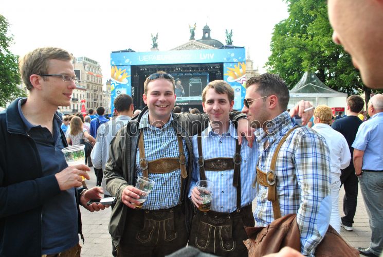 Немецкие болельщики ожидают начала торжественной церемонии открытия фан-зоны ЕВРО-2012 во Львове, в четверг, 7 июня 2012 г. Площадка в городе Львов, вмещающая до 28 тысяч людей, будет функционировать до 1 июля. Развлекательной программой официальной фан-зоны предусмотрены концерты украинских звезд, известных коллективов, а также молодых исполнителей. Посетителей фан-зоны ежедневно будут развлекать известные львовские радио-ведущие. Евро-2012 пройдет с 8 июня по 1 июля 2012 года на Украине и в Польше. На Украине матчи состоятся в Харькове, Львове, Донецке и Киеве. В Польше принимающими городами станут Варшава, Вроцлав, Гданьск и Познань. Фото Валерия Шмакова / УНИАН