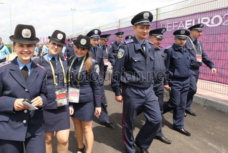 Сотрудники милиции возле фан-зоны ЕВРО-2012, во Львове, в четверг, 7 июня 2012 г. Площадка в городе Львов, вмещающая до 28 тысяч людей, будет функционировать до 1 июля. Развлекательной программой официальной фан-зоны предусмотрены концерты украинских звезд, известных коллективов, а также молодых исполнителей. Посетителей фан-зоны ежедневно будут развлекать известные львовские радио-ведущие. Евро-2012 пройдет с 8 июня по 1 июля 2012 года на Украине и в Польше. На Украине матчи состоятся в Харькове, Львове, Донецке и Киеве. В Польше принимающими городами станут Варшава, Вроцлав, Гданьск и Познань. Фото УНИАН