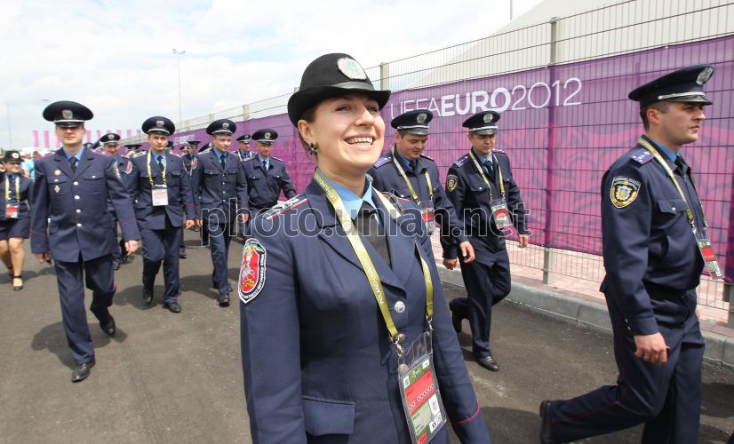 Сотрудники милиции возле фан-зоны ЕВРО-2012, во Львове, в четверг, 7 июня 2012 г. Площадка в городе Львов, вмещающая до 28 тысяч людей, будет функционировать до 1 июля. Развлекательной программой официальной фан-зоны предусмотрены концерты украинских звезд, известных коллективов, а также молодых исполнителей. Посетителей фан-зоны ежедневно будут развлекать известные львовские радио-ведущие. Евро-2012 пройдет с 8 июня по 1 июля 2012 года на Украине и в Польше. На Украине матчи состоятся в Харькове, Львове, Донецке и Киеве. В Польше принимающими городами станут Варшава, Вроцлав, Гданьск и Познань. Фото УНИАН