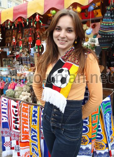 Девушка возле киоска с сувенирами перед началом торжественной церемонии открытия фан-зоны ЕВРО-2012, во Львове, в четверг, 7 июня 2012 г. Площадка в городе Львов, вмещающая до 28 тысяч людей, будет функционировать до 1 июля. Развлекательной программой официальной фан-зоны предусмотрены концерты украинских звезд, известных коллективов, а также молодых исполнителей. Посетителей фан-зоны ежедневно будут развлекать известные львовские радио-ведущие. Евро-2012 пройдет с 8 июня по 1 июля 2012 года на Украине и в Польше. На Украине матчи состоятся в Харькове, Львове, Донецке и Киеве. В Польше принимающими городами станут Варшава, Вроцлав, Гданьск и Познань. Фото УНИАН