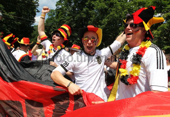 Болельщики из Германии гуляют перед началом матча финальной части Чемпионата Европы по футболу ЕВРО-2012 между сборными Германии и Португалии во Львове, в субботу, 9 июня 2012 г. Фото Евгения Малолетки / УНИАН