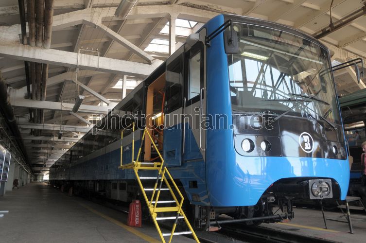 Новый поезд метро Крюковского вагоностроительного завода стоит в Московском депо города Харькова во вторник, 26 июня 2012 г. В этот день Харьковским метрополитеном был представлен новый поезд метро производства Крюковского вагонного завода. Фото Владимира Андреева /УНИАН