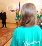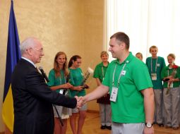 Премьер-министр Украины Николай Азаров (слева) во время встречи с лучшими волонтерами, помогавшими обеспечивать проведение в Украине Евро-2012 в Киеве, в понедельник, 2 июля 2012 г. Во во время встречи премьер-министр Украины Николай Азаров поблагодарил волонтеров Евро-2012 за улучшение имиджа Украины. Глава правительства наградил волонтеров ценными подарками и благодарностями Кабинета министров. Фото Олега Маркевича / POOL / УНИАН