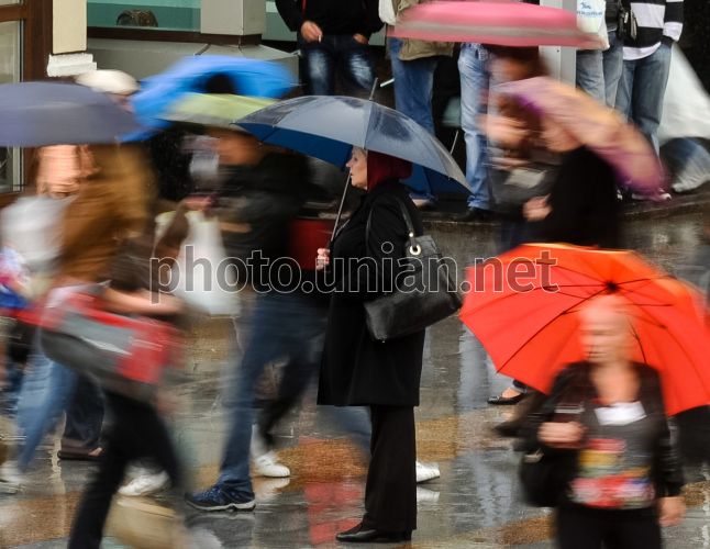 Прохожие с зонтиками в Киеве, в понедельник, 13 августа 2012 г. В Киеве удерживается дождливая погода, подтоплены некоторые улицы, затруднено автомобильное движение. 14 августа в Украине объявлено штормовое предупреждение, ожидается повышение уровня воды на реках бассейнов Сяна, Днестра, Прута, Сирета (Львовская, Ивано-Франковская, Черновицкая области). Украинский гидрометцентр сообщает, что прекращение дождей ожидается в Украине только с 17 августа. Фото Евгения Малолетки / УНИАН