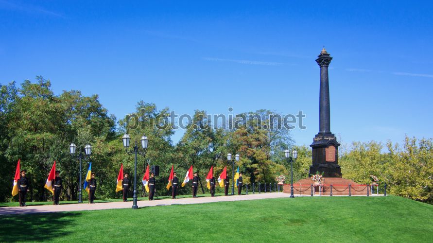 Отреставрированная Александровская колонна, установленная в честь российского императора Александра II, во время церемонии открытия в Одессе, в воскресенье, 2 сентября 2012 г. В центральном парке культуры и отдыха им. Тараса Шевченко в этот день торжественно открыли после реконструкции Александровскую колонну, установленную в 1891 году в честь посещения Одессы российским императором Александром II. Колонна воссоздана в первозданном виде: восстановлены все детали лепки, в том числе и на вершине колонны с двуглавыми орлами, шапка Мономаха, мемориальные доски, а также вензель Александра II из цветов. Фото Александра Гиманова / УНИАН
