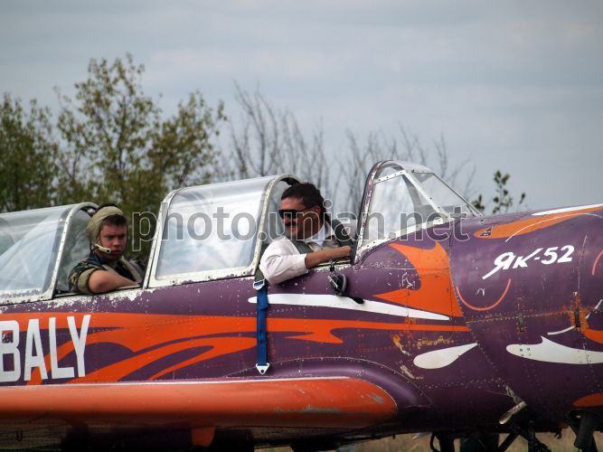Участники фестиваля сидят в аэроплане на спортивном аэродроме "Гидропорт" во время «Одесского Фестиваля Малой Авиации 2012» в Одессе, в субботу, 8 сентября 2012 г. В этот день в Одессе прошло авиашоу, на котором можно было увидеть демонстрационные полеты, показательные выступления спортсменов-парашютистов, полеты воздушных шаров, воздушные бои радиоуправляемых авиамоделей, а также демонстрацию современных моделей авиатехники. Участникам II «Одесского Фестиваля Малой Авиации 2012» продемонстрировали уникальный самолет «FARMAN-IV», а также самолет «ANATRA-2», копию самолета времен Первой мировой войны «Анатра-Анасаль». Фото Александра Вельможко / УНИАН