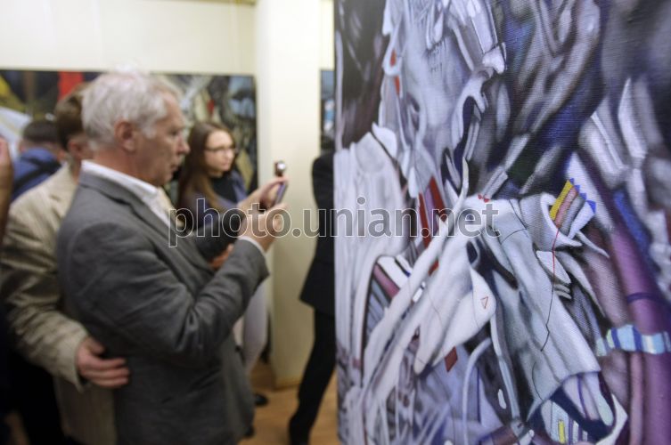 Посетитель рассматривает картины украинского художника Ивана Марчука во время открытия выставки «Погляд у безмежність» в Киеве, в четверг, 13 сентября 2012 г. Десятый цикл работ украинского художника Ивана Марчука полностью отличается от девяти предыдущих. "Погляд у безмежність" - это мистическая серия, открывающая зрителям другой мир, "пятое измерение" реальности, сообщают организаторы выставки. Уникальный стиль исполнения автор называет абстрактным сюрреализмом. На открытии выставки Иван Марчук лично представлял гостям свои работы. Фото Андрея Скакодуба / УНИАН