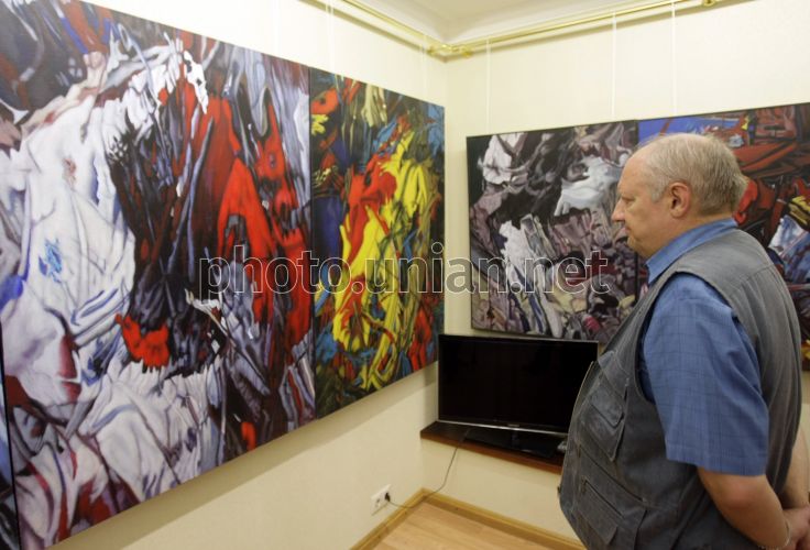 Посетитель рассматривает картины украинского художника Ивана Марчука во время открытия выставки «Погляд у безмежність» в Киеве, в четверг, 13 сентября 2012 г. Десятый цикл работ украинского художника Ивана Марчука полностью отличается от девяти предыдущих. "Погляд у безмежність" - это мистическая серия, открывающая зрителям другой мир, "пятое измерение" реальности, сообщают организаторы выставки. Уникальный стиль исполнения автор называет абстрактным сюрреализмом. На открытии выставки Иван Марчук лично представлял гостям свои работы. Фото Андрея Скакодуба / УНИАН
