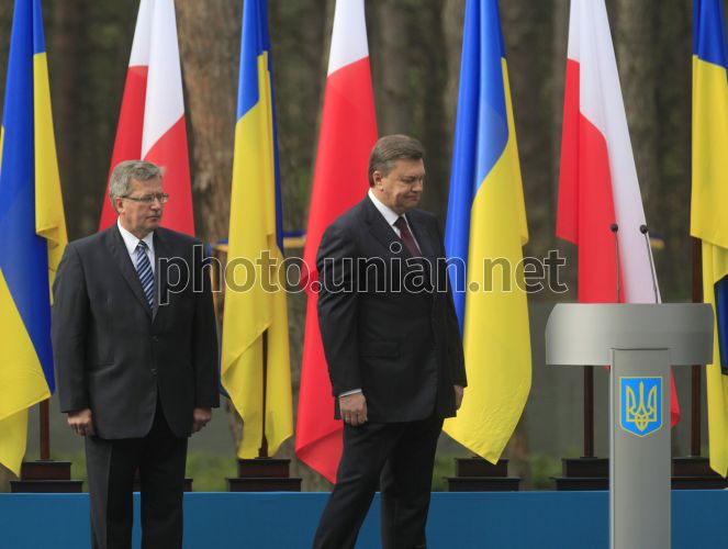 Президент Украины Виктор Янукович и Президент Республики Польша Бронислав Коморовский (слева) во время церемонии открытия Мемориала жертвам тоталитаризма на территории Национального историко-мемориального заповедника «Быковнянские могилы» под Киевом, в пятницу, 21 сентября 2012 г. Главы государств возложили цветы к Памятному знаку польских захоронений, Братской могиле и к Мемориалу жертвам тоталитаризма. Прозвучали Государственные Гимны Украины и Польши. Присутствующие почтили память погибших минутой молчания. Во время визита Президента Польши в Украину 28 ноября 2011 года Главы двух государств приняли участие в церемонии закладки на месте будущего Мемориала капсулы и шести урн с землей из мест, где были заключены польские граждане. Фото Владислава Мусиенко / УНИАН