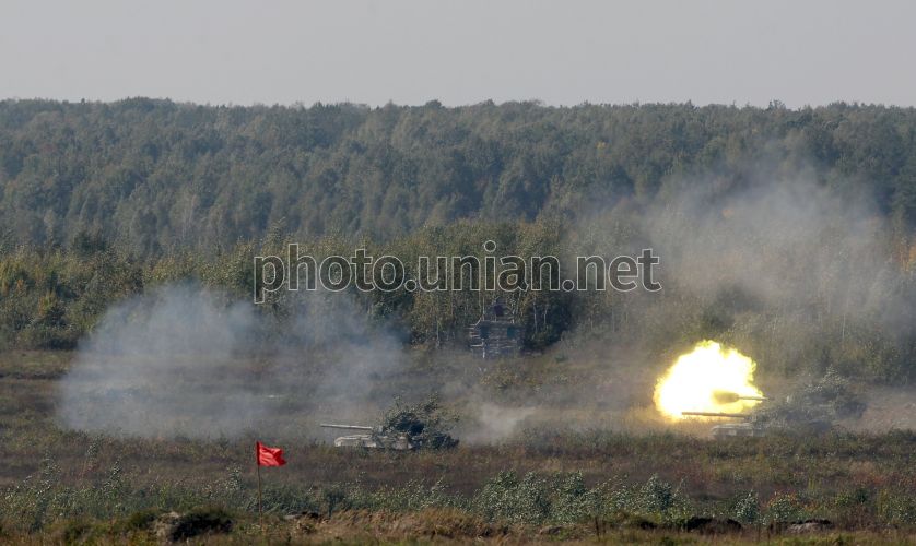 БТР во время экспериментального тактико-специального учения с боевой стрельбой с ротной тактической группой на 240-м Центре подготовки подразделений 8-го армейского корпуса Сухопутных войск, в Житомирской области, в четверг, 27 сентября 2012 г. Учения проходили в рамках комплекса экспериментальных командно-штабных учений с органами военного управления и войсками "Перспектива-2012". К обучению в Житомирской области привлечено около 900 военнослужащих и 145 единиц военной техники. Демонстрационные действия выполняла разнородная тактическая группа в составе подразделений высокомобильных десантных войск, механизированных, артиллерийских подразделений, средств противовоздушной обороны, которая действовала при поддержке и во взаимодействии с частями специального назначения, подразделений фронтовой и армейской авиации. По сценарию учения, разнородная тактическая группа при поддержке авиации и артиллерии преодолела водную преграду, остановила условного противника на выгодном рубеже, заблокировала его и "уничтожила" на подступах к городу. Обучением было предусмотрено розыгрыш двух тактических эпизодов: с использованием системы имитации огневого поражения и контроля тактики действий подразделений "MILES" и с боевой стрельбой подразделений. 18 сентября 2012 г. в Вооруженных Силах Украины в соответствии с Планом боевой подготовки на 2012-й учебный год начался комплекс экспериментальных командно-штабных учений с органами военного управления и войсками (силами) "Перспектива-2012". Фото Евгения Малолетки / УНИАН