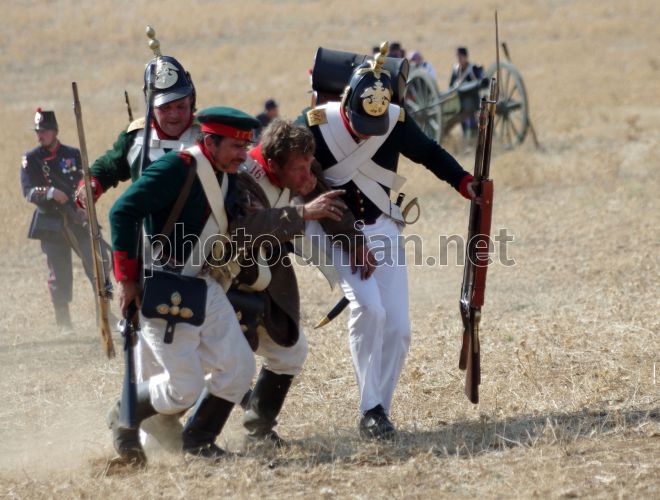 Участники военно-исторической реконструкции, посвященной Альминскому бою, в селе Вилино (Бахчисарайский район, Крым), в субботу, 29 сентября 2012 г. В Военном мемориале «Поле Альминского сражения» 28-30 сентября проходит V Международный военно-исторический фестиваль «Альминское Дело», посвященный 156-й годовщине окончания Восточной (Крымской) войны 1853-56 гг. Альминская битва - это первое крупное сражение Крымской войны. Она состоялась в сентябре 1854 года между войсками коалиции Великобритании, Франции и Турции с одной стороны, и России - с другой. Победу в Альминском сражении одержали войска коалиции. Фото Василия Батанова / УНИАН