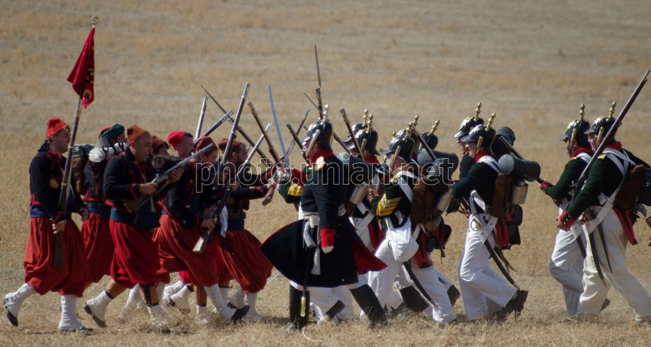Участники военно-исторической реконструкции, посвященной Альминскому бою, в селе Вилино (Бахчисарайский район, Крым), в субботу, 29 сентября 2012 г. В Военном мемориале «Поле Альминского сражения» 28-30 сентября проходит V Международный военно-исторический фестиваль «Альминское Дело», посвященный 156-й годовщине окончания Восточной (Крымской) войны 1853-56 гг. Альминская битва - это первое крупное сражение Крымской войны. Она состоялась в сентябре 1854 года между войсками коалиции Великобритании, Франции и Турции с одной стороны, и России - с другой. Победу в Альминском сражении одержали войска коалиции. Фото Василия Батанова / УНИАН