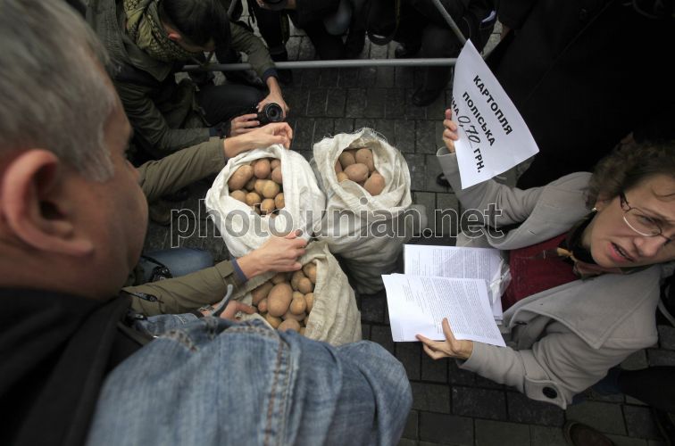 Участники акции "Кому нужна полесская картошка?" возле здания Кабмина в Киеве, в среду, 10 октября 2012 г. Во время акции полесские фермеры попытались продать министрам картошку нового урожая, которую не могут сбыть из-за ее низкой закупочной цены. Непроданная в ходе акции картошка будет передана одному из детских домов или детской больнице столицы. Фото Андрея Скакодуба / УНИАН