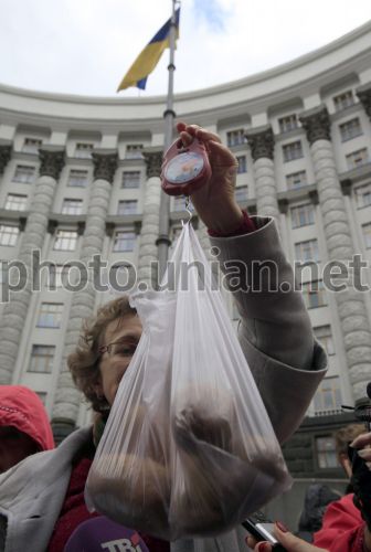 Участник акции "Кому нужна полесская картошка?" взвешивает килограмм картошки по цене 70 коп. возле здания Кабмина в Киеве, в среду, 10 октября 2012 г. Во время акции полесские фермеры попытались продать министрам картошку нового урожая, которую не могут сбыть из-за ее низкой закупочной цены. Непроданная в ходе акции картошка будет передана одному из детских домов или детской больнице столицы. Фото Андрея Скакодуба / УНИАН