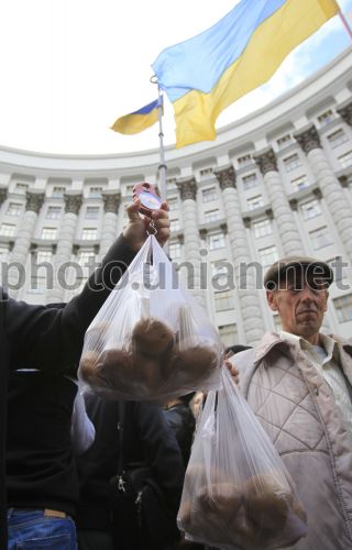Участник акции "Кому нужна полесская картошка?" взвешивает килограмм картошки по цене 70 коп. возле здания Кабмина в Киеве, в среду, 10 октября 2012 г. Во время акции полесские фермеры попытались продать министрам картошку нового урожая, которую не могут сбыть из-за ее низкой закупочной цены. Непроданная в ходе акции картошка будет передана одному из детских домов или детской больнице столицы. Фото Андрея Скакодуба / УНИАН