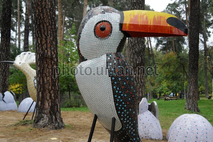 Скульптурная композиция в виде попугая в Парке Партизанской славы в Киеве, во вторник, 16 октября 2012 г. В киевском парке Партизанской Славы появилась "Дарницкая пейзажка", авторами работ которой выступили создатели Пейзажной аллеи, в том числе скульптор Константин Скретуцкий. Работы скульптора стали символичным элементом борьбы жителей Киева против уничтожения города из-за застроек и массовых вырубываний скверов и парков. Фото Олега Петрасюка / УНИАН