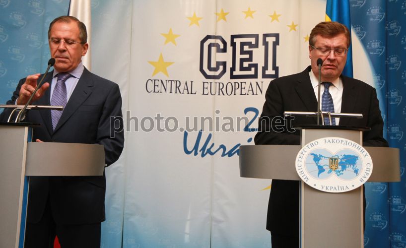 Министр иностранных дел Украины Константин Грищенко, справа, и министр иностранных дел Российской Федерации Сергей Лавров во время встречи в Киеве, в пятницу, 19 октября 2012 г. В этот день министр иностранных дел России Сергей Лавров посетил с рабочим визитом Киев, где встретился с министром иностранных дел Украины Константином Грищенко. Во время переговоров был обсужден весь комплекс двусторонних вопросов. В частности, обсуждалась международная проблематика, ход Приднестровского урегулирования, расширения договорно-правовой базы пребывания ЧФ РФ на территории Украины. Кроме того, министры обсудили реализацию крупных гуманитарных проектов, направленных на укрепление сотрудничества двух стран в культурной, образовательной, научной и других областях. По данным МИД Украины, визит С.Лаврова осуществлен в рамках подготовки встречи президентов Украины и России в Москве 22 октября. Фото Михаила Койфмана / УНИАН