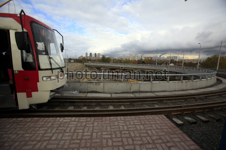 Станция скоростного трамвая и городской электрички "Троещина 2" в Киеве, в среду, 24 октября 2012 г. В этот день премьер-министр Украины в Киеве проверил готовность к пуску скоростного трамвая на Троещине - с ул. Милославской до пересадочного узла на Городскую кольцевую электричку. Премьер проехал в новом трамвае по кольцевой линии, что заняло приблизительно 10 минут. «На мой взгляд, жители Троещины получили достаточно удобный выход в центр Киева», - сказал он. Также премьер сообщил, что для удобства пассажиров, интервалы движения поездов кольцевой электрички планируется сократить. Движение скоростного трамвая от Трещины до кольцевой электрички начнется 25 октября в 6.00. До конца месяца проезд будет бесплатным. Фото Андрея Скакодуба / УНИАН