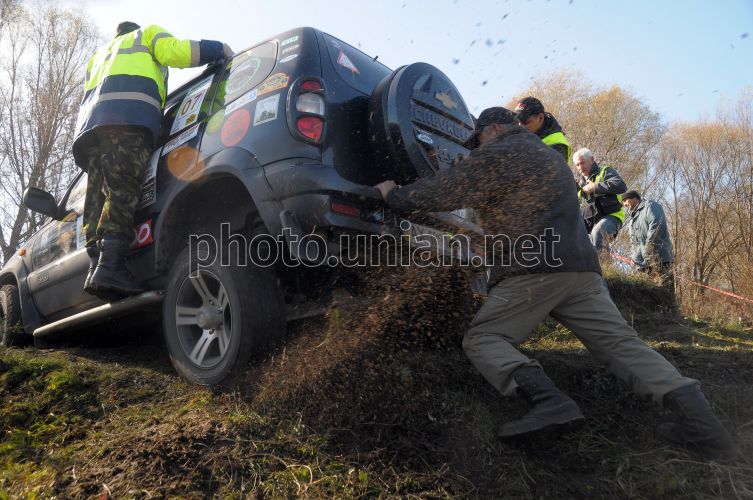 Участники ралли толкают застрявшую в грязи машину во время региональных соревнований по трофи-рейду в пос. Песочин (Харьковская обл.), в субботу, 27 октября 2012 г. В этот день в пос. Песочин прошли региональные соревнования по трофи-рейду "Песочин-Триал". В соревнованиях приняли участие 50 машин из разных городов Украины и России. Фото Владимира Андреева / УНИАН
