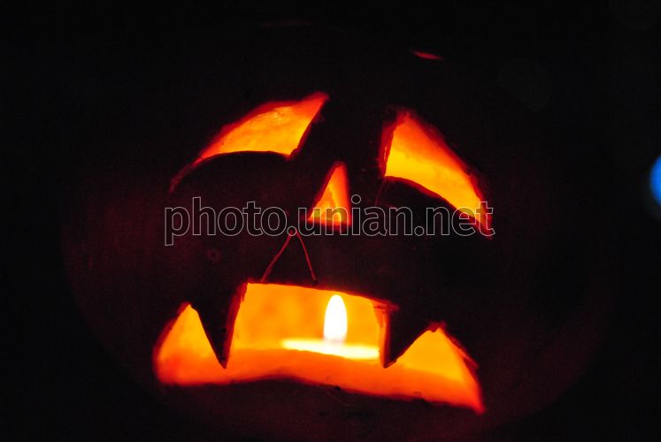 Светильник Джека в виде тыквы, на которой вырезана маска с горящей внутри свечой во время праздника Хэллоуин во Львове, в среду, 31 октября 2012 г. Хэллоуин (англ. Halloween) - преимущественно американский праздник, празднуется в ночь с 31 октября на 1 ноября. Также упоминается как ”канун Дня всех святых”. Праздник корнями уходит к старинному кельтскому празднеству Самайн. Одним из основных атрибутов является Светильник Джека (англ. ”Jack-o’Lantern”) в виде головы из вырезанной тыквы с зажженной свечой внутри. Появление этого символа чаще всего связывают с ирландской легендой о человеке по имени Джек, старом фермере, любителей азартных игр и крепких напитков. Он дважды обманывал дьявола, не отдав свою душу тому на попечительство, а когда пришел судный день, он не попал ни в рай (из-за своей порочной жизни), ни в ад - так как дьявол боялся его хитрости. Он был обречен скитаться по миру с тыквенной головой с тлеющим угольком внутри ее. Оранжевый и черный - основные цвета Хэллоуина. Фото Валерия Шмакова / УНИАН