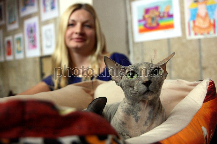 Кошка породы сфинкс во время выставки-конкурса "Мис-Кис-2012" в Ужгороде, в воскресенье, 25 ноября 2012 г. В этот день в Закарпатском областном дворце детского и юношеского творчества "Падиюн" прошел ежегодный конкурс "Мис-кис", на котором были представлены четыре категории четвероногих: беспородные, юниоры, породистые-короткошерстные, породистые-длинношерстные. Фото Яноша Немеша / УНИАН