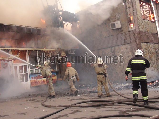 Пожарные во время ликвидации пожара в кафе "Светлана" в Мариуполе, в среду, 28 ноября 2012 г. На проспекте Карпова в Мариуполе горит кафе "Светлана". Огнем охвачено все здание, а дым пожара виден за многие километры от места ЧП. На месте работают пожарные расчеты. Информации о пострадавших и причинах пожара на данный момент нет. Фото Николая Рябченко / УНИАН