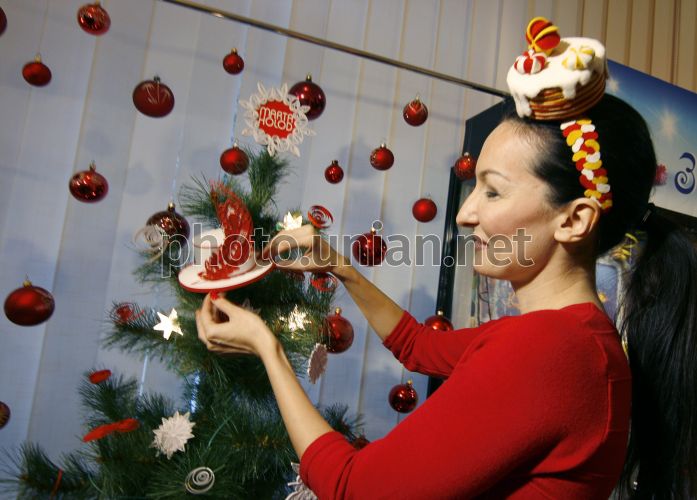 Участница выставки демонстрирует шляпку из бумаги во время выставки "Новогодние бумажные фантазии" в Киеве, в понедельник, 3 декабря 2012 г. В этот день в столице открылась выставка елочных украшений "Новогодние бумажные фантазии". В экспозиции представлены картонажные игрушки XIX-XX вв., фигурки из папье-маше начала прошлого века, рождественские литографические ангелы XIX века, самодельные украшения, изготовленные в киевских семьях более века назад. Фото Анны Корбут / УНИАН