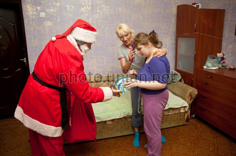 Дед Мороз дает подарок девочке во время благотворительной акции «Дед Мороз-2013» в Запорожье, в пятницу, 21 декабря 2012 г. По традиции, 70 «дедушек» в красных костюмах развозили подарки детям-сиротам и детям с ограниченными возможностями. Фото Александра Прилепы / УНИАН
