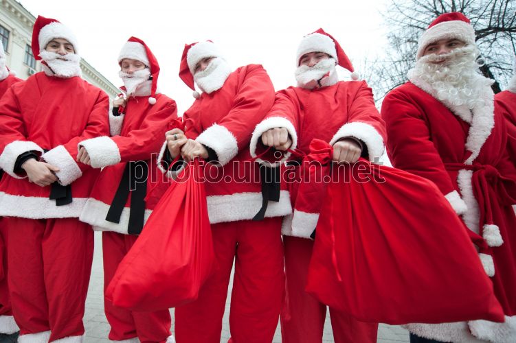 Участники благотворительной акции «Дед Мороз-2013» в Запорожье, в пятницу, 21 декабря 2012 г. По традиции, 70 «дедушек» в красных костюмах развозили подарки детям-сиротам и детям с ограниченными возможностями. Фото Александра Прилепы / УНИАН