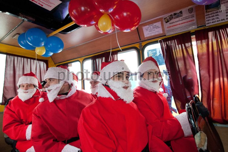 Участники благотворительной акции «Дед Мороз-2013» в Запорожье, в пятницу, 21 декабря 2012 г. По традиции, 70 «дедушек» в красных костюмах развозили подарки детям-сиротам и детям с ограниченными возможностями. Фото Александра Прилепы / УНИАН