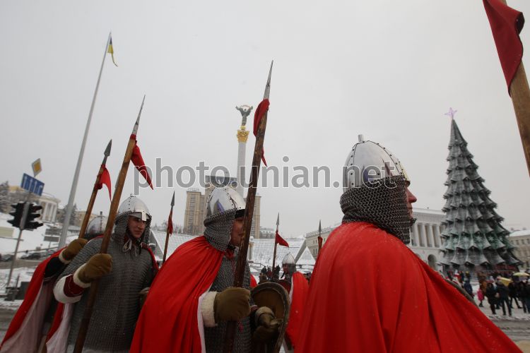 Артисты в костюмах богатырей во время открытия резиденции Деда Мороза на Майдане Незалежности в Киеве, в субботу, 22 декабря 2012 г. В этот день в столице состоялось официальное открытие резиденции Деда Мороза. Фото Евгения Малолетки / УНИАН