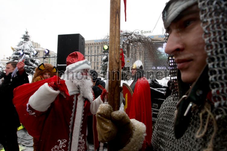 Артисты в костюмах богатырей и Дед Мороз стоят возле резиденции Деда Мороза на Майдане Незалежности в Киеве, в субботу, 22 декабря 2012 г. В этот день в столице состоялось официальное открытие резиденции Деда Мороза. Фото Евгения Малолетки / УНИАН