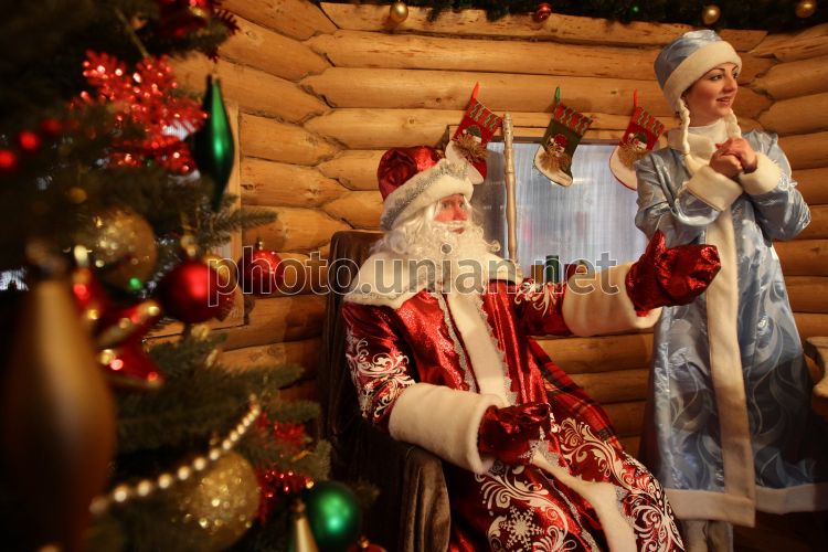 Артисты в костюме Деда Мороза и Снегурочки во время официального открытия резиденции Деда Мороза на Майдане Незалежности в Киеве, в субботу, 22 декабря 2012 г. В этот день в столице состоялось официальное открытие резиденции Деда Мороза. Фото Евгения Малолетки / УНИАН