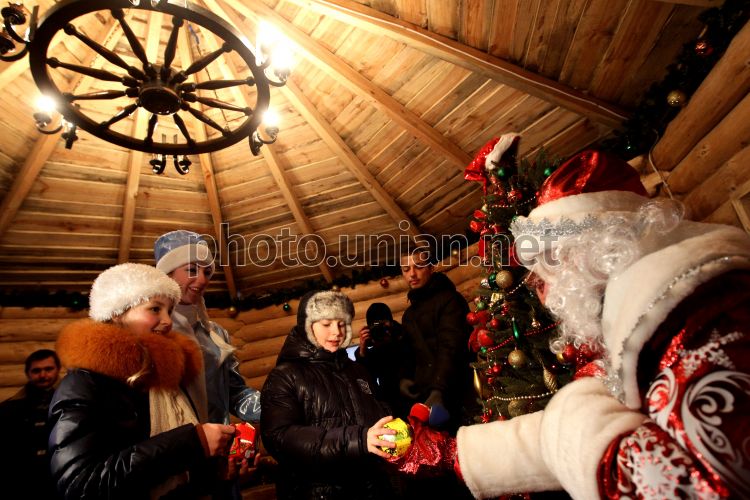 Артисты в костюме Деда Мороза и Снегурочки дарят подарки детям во время официального открытия резиденции Деда Мороза на Майдане Незалежности в Киеве, в субботу, 22 декабря 2012 г. В этот день в столице состоялось официальное открытие резиденции Деда Мороза. Фото Евгения Малолетки / УНИАН
