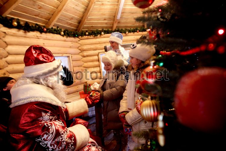 Артисты в костюме Деда Мороза и Снегурочки дарят подарки во время официального открытия резиденции Деда Мороза на Майдане Незалежности в Киеве, в субботу, 22 декабря 2012 г. В этот день в столице состоялось официальное открытие резиденции Деда Мороза. Фото Евгения Малолетки / УНИАН