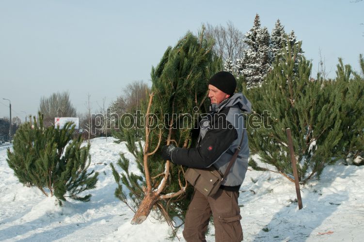 Мужчина несет сосну на территории Александровского лесничества в Запорожской области, в понедельник, 24 декабря 2012 г. В эти дни в Александровском лесничестве завершается вырубка елок, которые отправятся на елочные базары. В лесничестве выращивают крымскую сосну, которая успешно прижилась на Запорожской земле. Фото Александра Прилепы / УНИАН